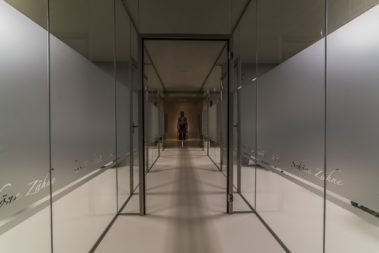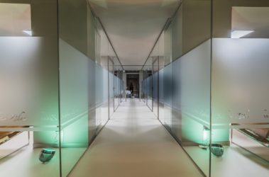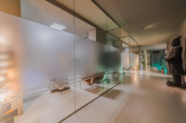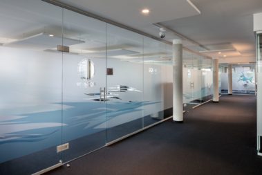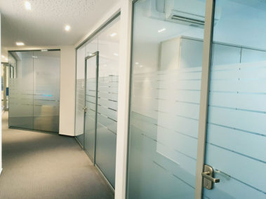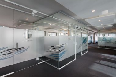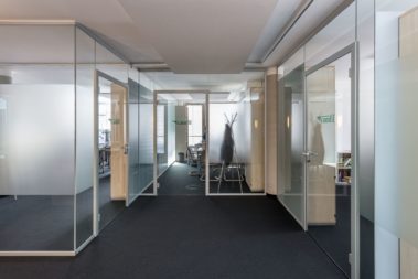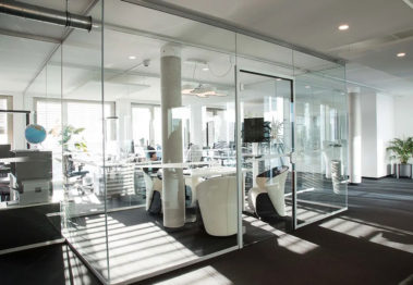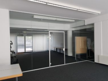 Versehen werden die Glastrennwände, welche in schmale Aluminiumzargen eingeklebt werden, mit einer Ganzglastür aus Sicherheitsglas und integriertem Schallschutz.