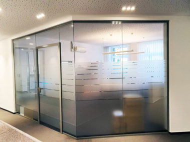 Wenn Sie doch etwas mehr Privatsphäre in Ihren Büroräumen ermöglichen möchten, empfehlen wir Ihnen eine Beschichtung der Glasoberflächen. Mit speziellen Folien lässt sich das transparente Glas individuell transluzent in Milchglasoptik oder vollkommen blickdicht beschichten. Dabei entscheiden Sie ganz nach Ihren Wünschen, ob nur bestimmte Bereiche abgedeckt werden sollen oder die komplette Fläche. Auch eine Gestaltung der Glastrennwände mit farbiger Folie ist auf diese Weise möglich. Die Folien können jederzeit rückstandslos entfernt werden.