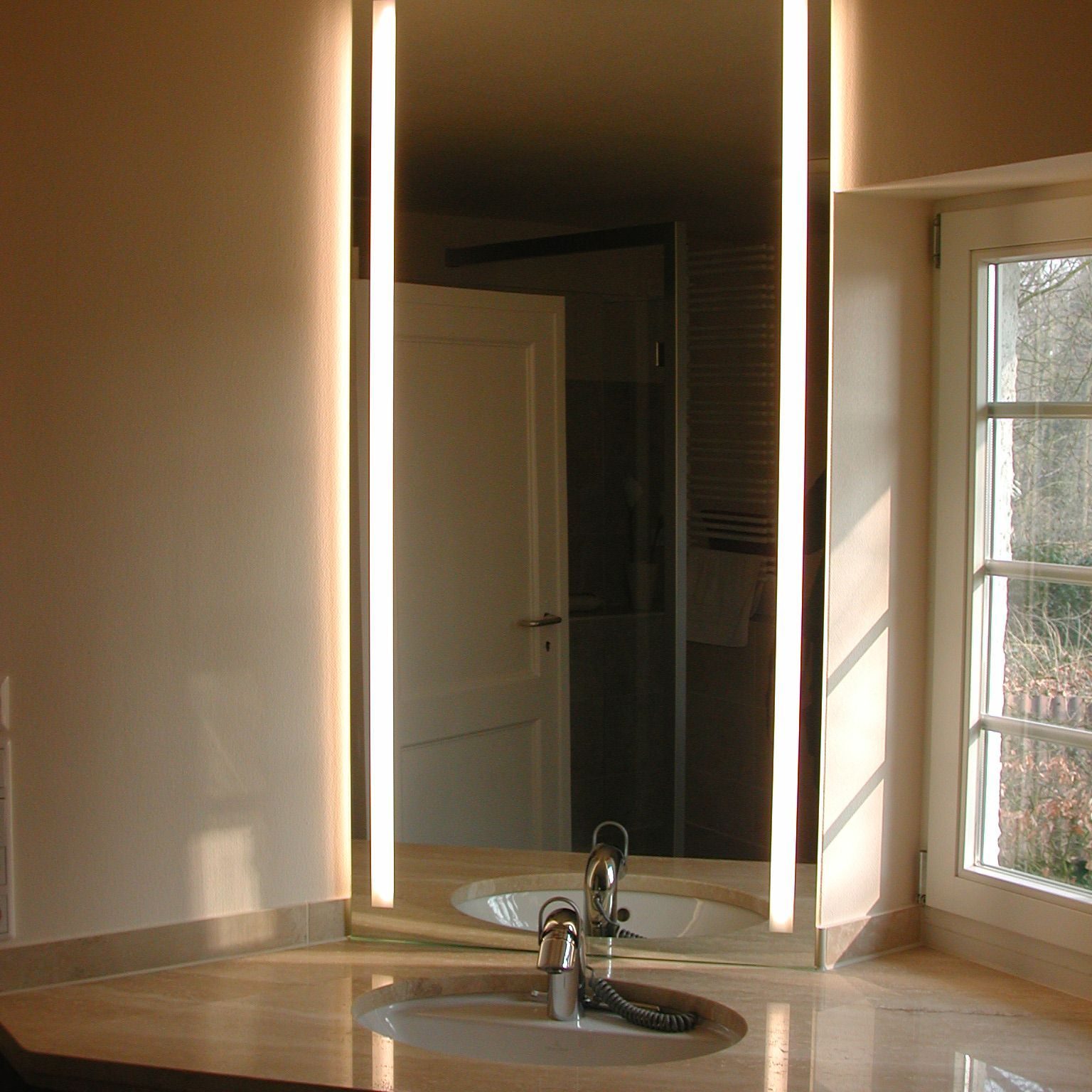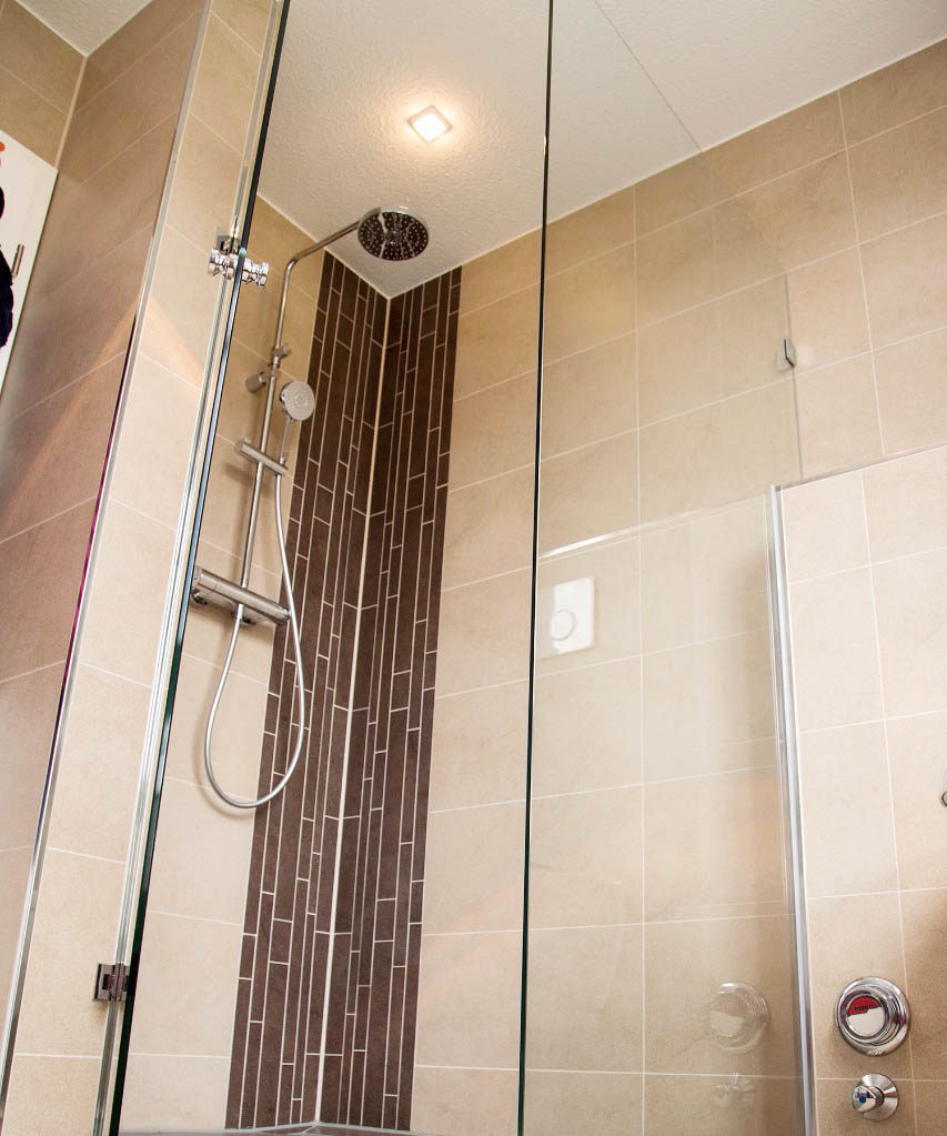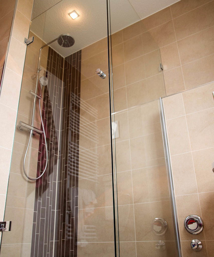 Wir verwenden für den Glasbau im Badezimmer ein 8 mm starkes Sicherheitsglas mit verchromten Messingbeschlägen. Dies erfüllt die Funktionsanforderungen nach den Normen DIN 18361 und DIN 1249 und garantiert Ihnen somit ein sicheres Duschvergnügen. Glasklar bleiben unsere Duschanlagen, Duschrückwände aus Glas und Spiegel dank modernster Oberflächenveredelung auch nach jahrelanger Nutzung.